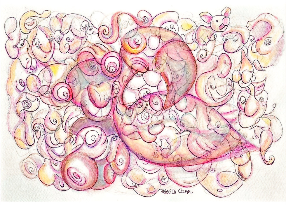 I returned to the kind of drawing I loved as a child not by conscious intention, but by instinct. As a young girl, I found comfort in letting lines wander freely across the page and discovering characters hidden inside them. After years of negotiating adult life, illness, and emotional turbulence, my hands brought me back to this practice, before my mind understood why. It steadies me. It makes space inside the noise.